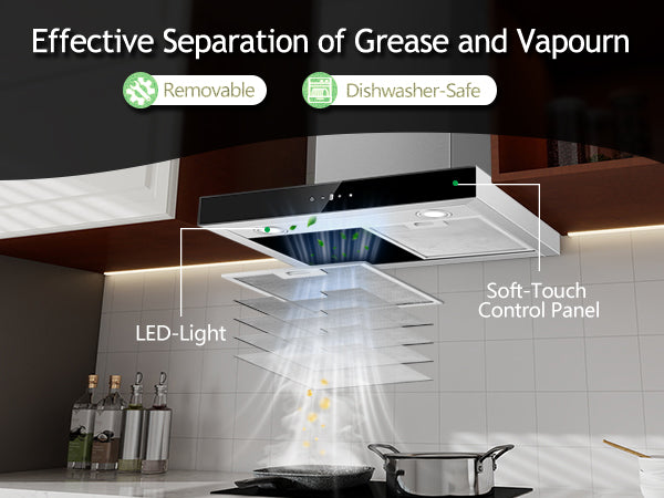 Easy installation with user-friendly design. Mount 650-750mm above the hob for optimal performance.